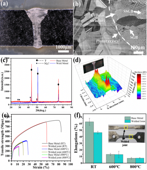 (a)GH3539激光焊接接頭焊接截面;(b)GH3539合金微觀組織;(c)GH3539合金激光焊接接頭XRD結果;(d)GH3539合金激光焊接接頭硬度分布;(e)不同溫度下母材及焊接接頭的工程應力-應變曲線;(f)不同溫度下母材及焊接接頭的平均延伸率。